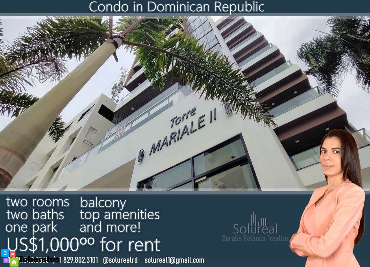 Apartamento en alquiler de 2 habitaciones con balcón eficiente (2do piso). Distribución moderna, comodidad y seguridad. Proyecto terminado sin estrenar en TORRE MARIALE II. Ubicado en el sector La Julia, Zona Universitaria de Santo Domingo. *Detalles generales-De 89Mts2-2 baños-Balcón-Sala-Comedor-Cocina modular-Closet espacioso-Baño de visitas-Lavadero-Calentador de agua instalado *Terminación - Techo en yeso, tope en granito natural, piso de clase premium, griferías y cerámicas importadas. *Características generales-Lobby acogedor -Parqueo soterrado-Intercom videoportero, Sistema de vigilancia 24-7, Seguridad de control de acceso electrónico-Portón eléctrico-Ascensor-2 bombas de agua de sumini...